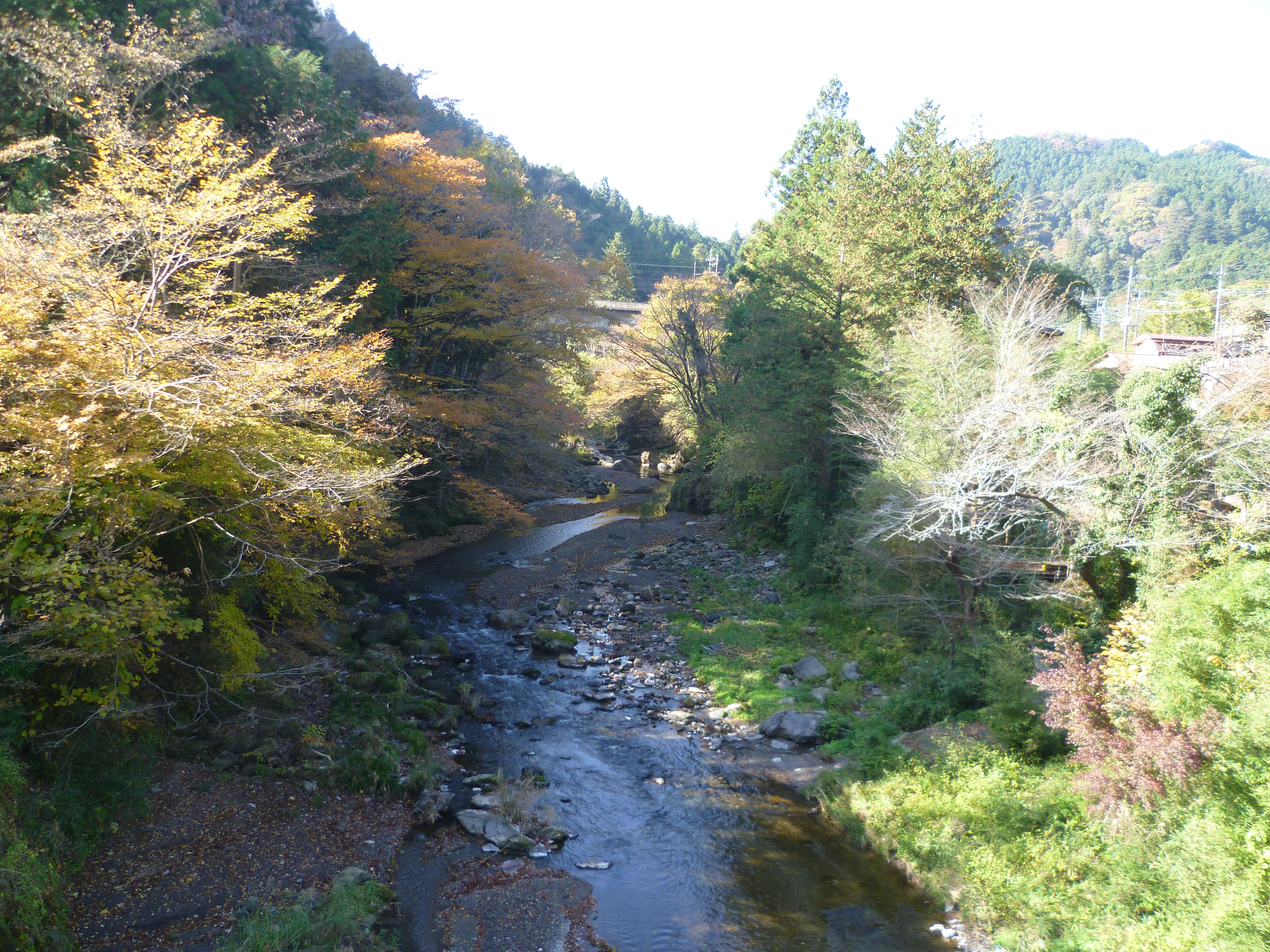 入口の手前に橋があるのですが、その橋からの高麗川の景色です。紅葉ではないですが、川と背景の自然の景色が良いです。